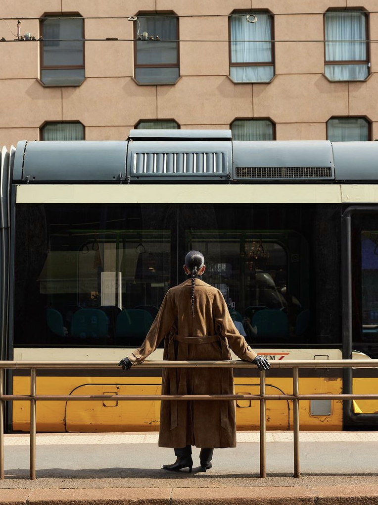 用内敛的暗红色皮包和slingback,把经典短款风衣穿出了美艳味道,皮质的油润光泽,让人联想到美拉德反应呈现的油脂感,紧扣秋冬流行主题。
