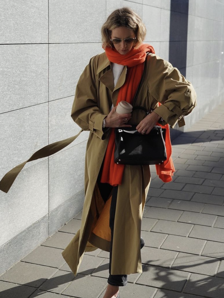 Anouk Yve的风衣搭配则适用于北方,一条亮橘色围巾阻挡了北风从领口灌向全身,还为风衣注入生气,将秋天莫名涌来的伤感一扫而光。