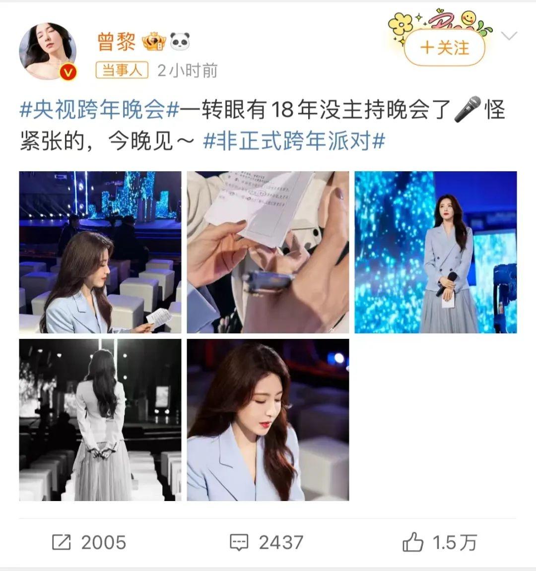 12月31日,话题#曾黎主持央视跨年#冲上热搜。47岁曾黎刚刚回应自己将主持央视跨年晚会,“一转眼有18年没主持晚会了,怪紧张的,今晚见~”她还晒出了彩排的照片,只见曾黎身着浅蓝色西装搭配纱裙,台风大气明快,气场十足。