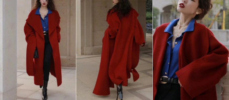 第三套复古惊艳风,阔版型的红色毛呢大衣,一上身气场全开,红色艳丽热烈,内搭蓝色复古感针织衫,配一条黑色紧身牛仔裤,整套Look复古氛围十足,气场超强,职场女强人形象树立起来,在新一年的工作中节节高升,气场全开,屡战屡胜。