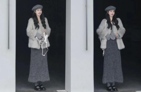 第二套温柔贵气感,这套灰色系皮草穿搭将皮草自带的贵气感弱化,灰色的皮草更显得温柔低调,搭配一条深灰色裙子,轻度贵气感更加适合开年复工穿搭。