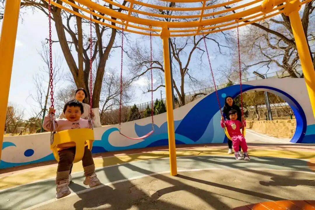 进入银地花园,最引人注目的要数园区中段的儿童乐园,众多老人孩子在此相聚,在欢乐中开启新的一天。儿童活动区内设置有滑梯、沙坑、蹦床、攀爬网、涂鸦板、秋千等丰富的游憩设施,孩子们沉浸其中,流连忘返。