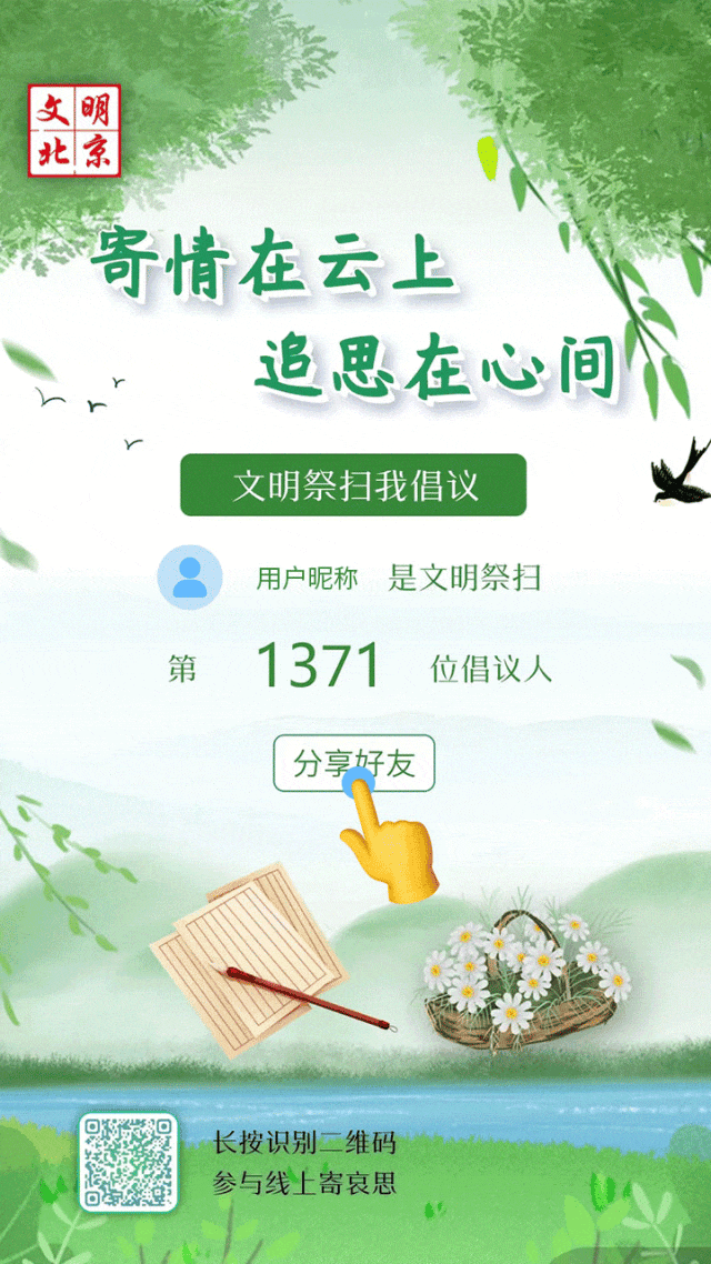 又是一年清明际,又是追念故人时。在这缅怀先辈、寄托哀思的重要时节,“文明北京”开展“寄情在云上,追思在心间”清明节线上云祭扫活动。让我们倡导文明祭扫新风尚,过一个绿色、平安、健康的清明节!