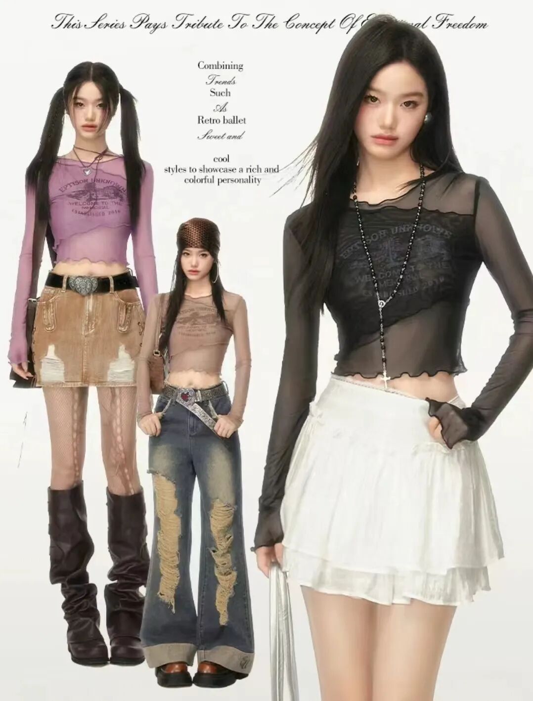 半透视的网纱营造辣妹氛围感,黑色显瘦性感,搭配半身白色短裙增添一丝纯欲氛围,棕色透肤上衣穿出“废土风”,站在时髦浪尖的女孩,紧跟时尚流行趋势。