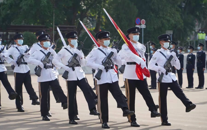 其中,香港警队是成立177年来首次向公众表演中式步操,并一改用英语指挥步操口令的传统,首次用广东话喊出“向右看齐”等口令。