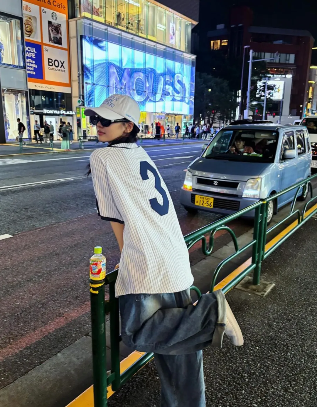 宁艺卓在东京出游给我们带来了球衣的穿搭新创意,选择一件衬衫式球衣可谓别出心裁,既保留球衣的独特廓形,也能给造型多点发挥空间。搭配一顶棒球帽和双麻花辫洋溢着东京辣妹的甜酷气场,摆好姿势,就可分分钟出片。