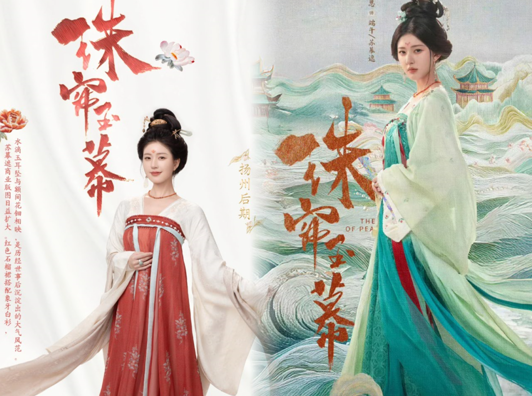 《珠帘玉幕》以大唐为背景,讲述采珠奴端午逆袭成为珠宝商的传奇经历,前期端午的服饰简单破旧,在成为珠姬卖珠时,一袭红衣敦煌舞惊艳全场,妆造美艳动人,发髻旁的两缕青丝修饰脸型,增添一丝飘逸魅惑感。剧中端午的服装多数是清新淡雅的唐装,妆容上比较小家碧玉,后期化身珠宝商人苏幕遮,发型更加成熟,盘发花钿妆造展现了端午从坚韧少女蜕变至成熟女商的气质,从柔弱到强大。《珠帘玉幕》剧情的跌宕起伏,端午从挣扎生存到强大的女商人,后续如何发展,我们拭目以待吧~