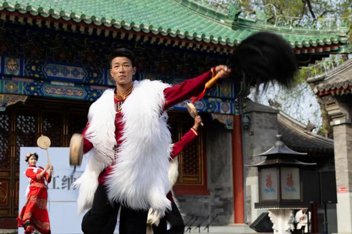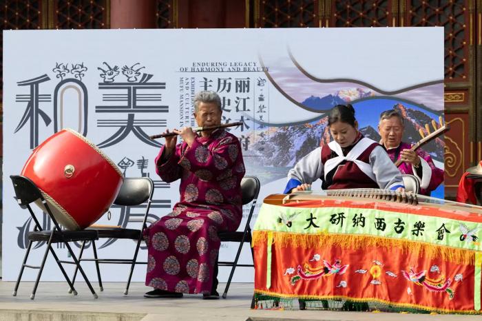 恭王府银安殿前,来自大研纳西古乐的传承人为观众演奏。