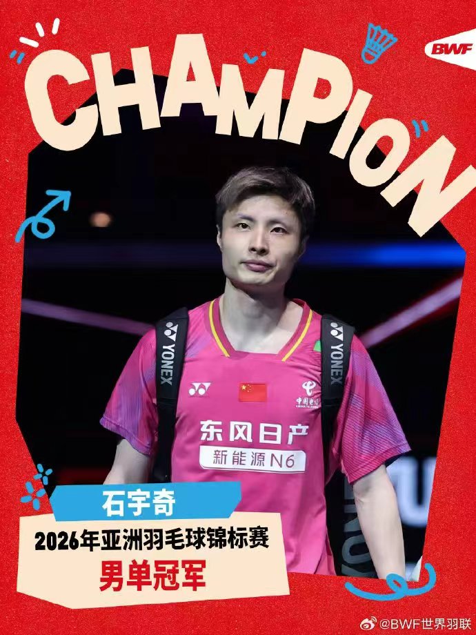 4月12日傍晚,在宁波2026亚洲羽毛球锦标赛男子单打决赛中,中国选手石宇奇以2比0击败印度新秀阿尤什·谢蒂,职业生涯首夺亚锦赛冠军。这也是中国羽毛球队时隔9年再次站在该项赛事的男单冠军领奖台上,上一次国羽夺得亚锦赛男单冠军还是在2017年,当时的冠、亚军被谌龙和林丹包揽。石宇奇也借助此次夺冠,下周将重返世界第一宝座。