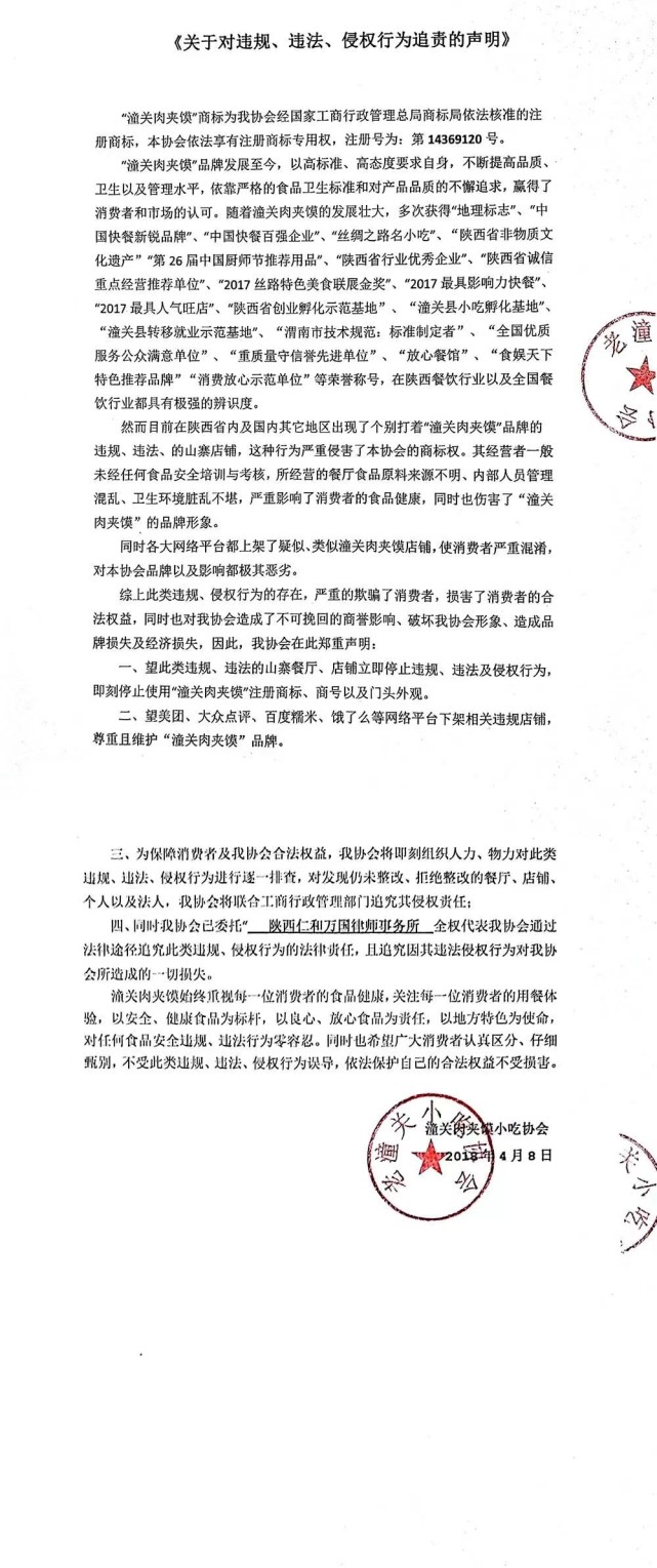 该协会表示,希望此类违规、违法的山寨餐厅、店铺立即停止违规、违法及侵权行为,即刻停止使用“潼关肉夹馍”注册商标、商号以及门头外观;望美团、大众点评、百度糯米、饿了么等网络平台下架相关违规店铺,尊重且维护“潼关肉夹馍”品牌;为保障消费者及协会合法权益,协会将即刻组织人力、物力对此类违规、违法、侵权行为进行逐一排查,对发现仍未整改、拒绝整改的餐厅、店铺、个人以及法人,协会将联合工商行政管理部门追究其侵权责任;同时,协会已委托陕西仁和万国律师事务所全权代表协会通过法律途径追究此类违规、侵权行为的法律贵任,且追究因其违法侵权行为对协会所造成的一切损失。
