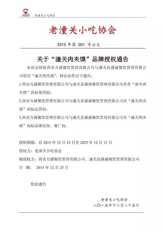 “潼关肉夹馍”商标于2015年12月14日被核准为注册商标,过了不到半个月,2015年12月25日,老潼关小吃协会(潼关肉夹馍协会前身)就授权西安万盛餐饮管理有限公司与潼关县盛潼餐饮管理有限公司使用“潼关肉夹馍”,两家公司具有该商标使用权、运营权及商标品牌宣传、推广权,授权期限为2015年12月25日至2025年12月13日。