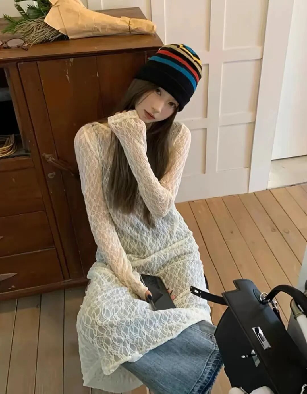 前段时间爆火的“屁帘”本质上也是属于透视感穿搭的一种,薄纱材质若隐若现。这一套穿搭结合了当下韩国最流行的两种元素,透视感上衣外搭一件蓝色小吊带,下穿浅蓝色牛仔裤搭配蕾丝“屁帘”,时髦精穿搭get。