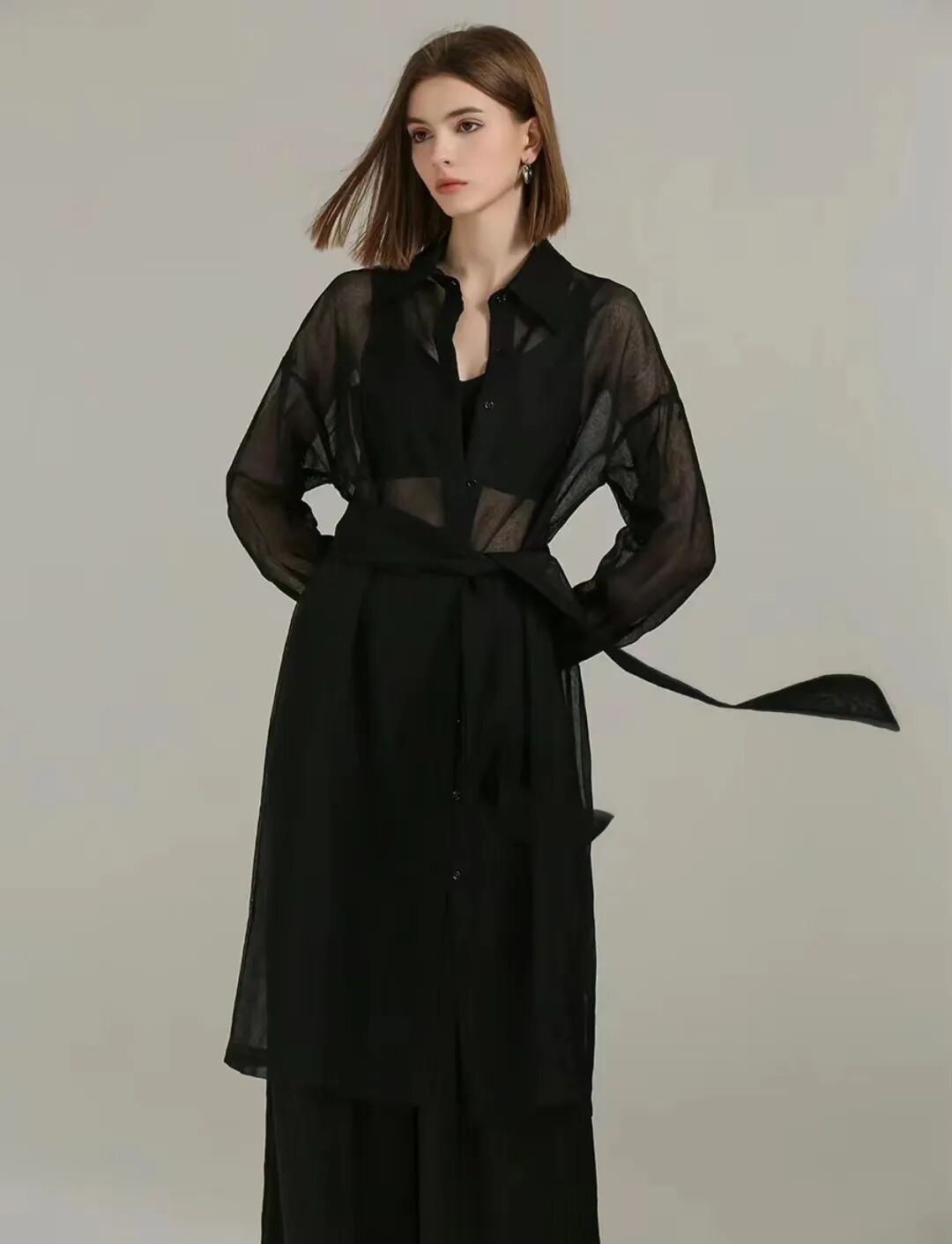 黑色长款这一件充满酷飒领导风范,气质优雅而霸气,具有疏离感的魅力。薄纱长衬衫本身轻盈凉爽,微微透视的小心机,搭配一件黑色内搭,一条黑色长裙,气场全开!