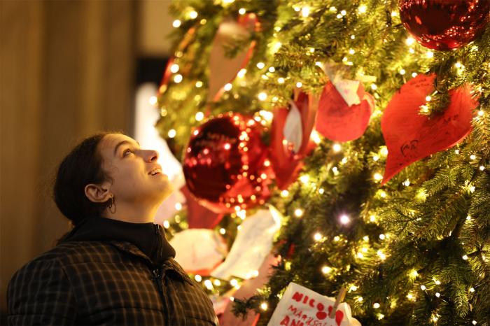 12月14日,一名女子在意大利首都罗马市中心的科尔索大道附近赏灯。