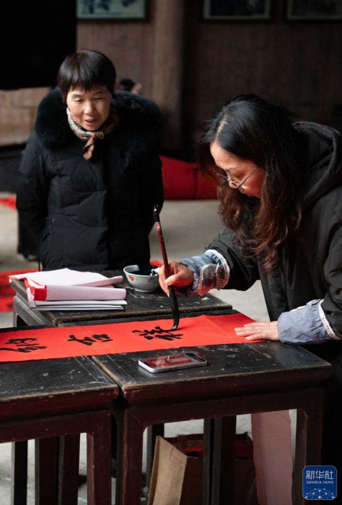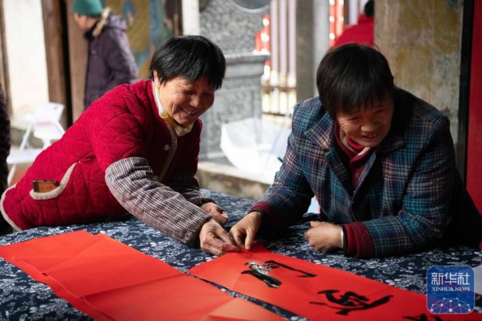 在安徽省黄山市黟县南屏村,村民参加写春联活动。