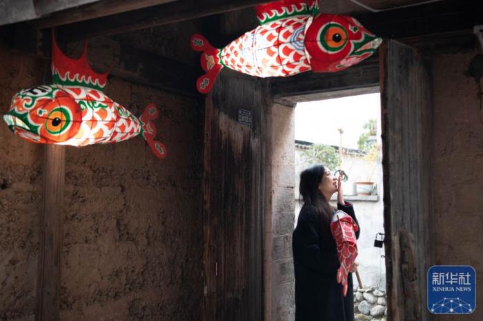 在安徽省黄山市黟县碧山村,游客在当地民居门前手持鱼灯留影。