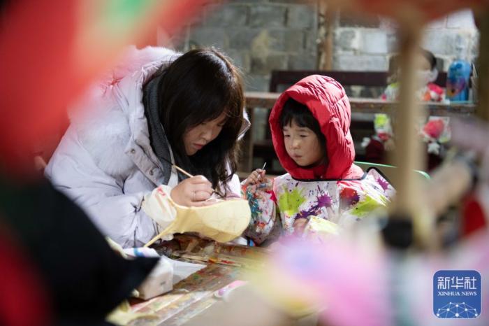 在安徽省黄山市黟县碧山村,小朋友和家长体验鱼灯制作。