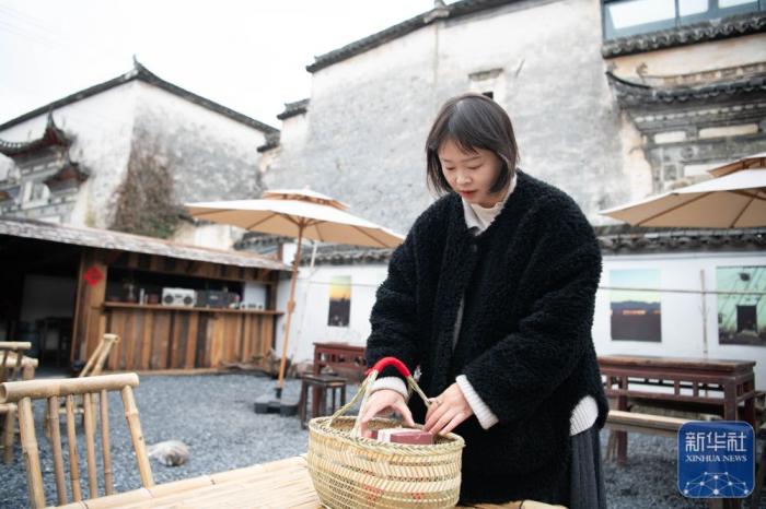 在安徽省黄山市黟县碧山村,商户打包客人购买的特色年货。