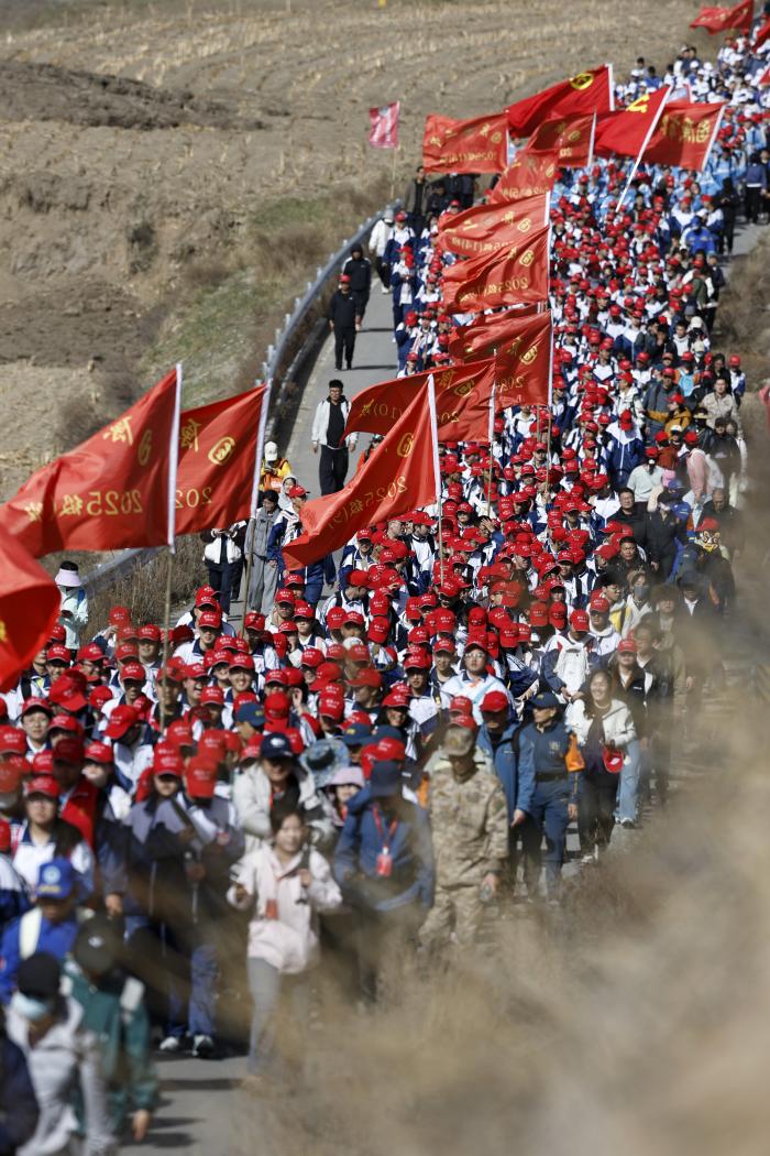 红军长征“胜利之山”六盘山脚下的宁夏固原市是革命老区。固原二中和弘文中学两所学校清明节徒步百里祭英烈活动,至今已坚持了31年。重走长征路,祭奠英烈,不仅是体力的极限挑战,也是心灵的洗礼。4月3日,参加徒步祭英烈活动的师生翻越黄峁山(无人机照片)。