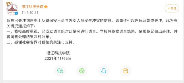 11月4日,有网友发布视频称,广东省湛江市一学校内保安人员与外卖人员发生冲突,视频当中二人大打出手,周围也有很多人员上前劝阻。涉事的湛江科技学院11月5日发布通报,称学校已关注到网络上反映保安人员与外卖人员发生冲突的信息,该事件引起网民及媒体关注,学校高度重视,已成立调查组对此情况进行调查,学校将依据调查结果,依规依纪做出处理,并将调查处理结果及时公布。