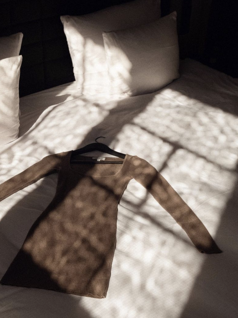 实在是厚实的款式,就挑选短袖、大领口的设计吧,同样能给予棕色调注入空气感。