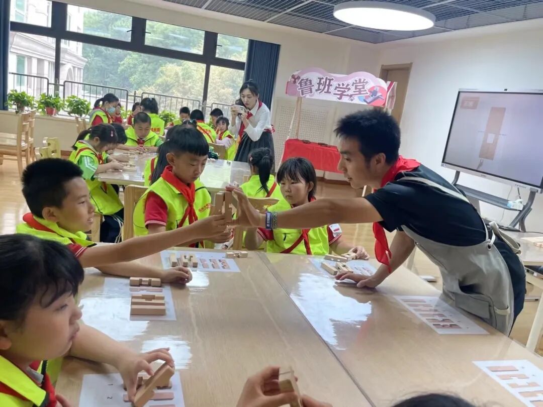 在红领巾成长营的“鲁班学堂”,队员们通过学习组装“鲁班锁”来体验榫卯结构的精妙。鲁班锁是2500年前中国古人发明的益智玩具,是榫卯结构的集中展现,三维拼插,内部卯榫咬合,外观严丝合缝,易拆难装,十分巧妙。队员们迫不及待地拿起来玩,没想到看起来只是简单的6个小部件,到了手里却仿佛变成了捉摸不透的“万花筒”,小小的鲁班锁,既让队员们挠头,又让队员们着迷。有的队员一边拼装一边嘟囔:“古人怎么这么聪明呀,这是怎么设计出来的……”有的队员反复拼装拼不出来,后来经过老师的讲解拼装成功了,兴奋地喊道:“我拼出来了!我成功了!”实践出真知,队员们深深为古人的智慧所折服。
