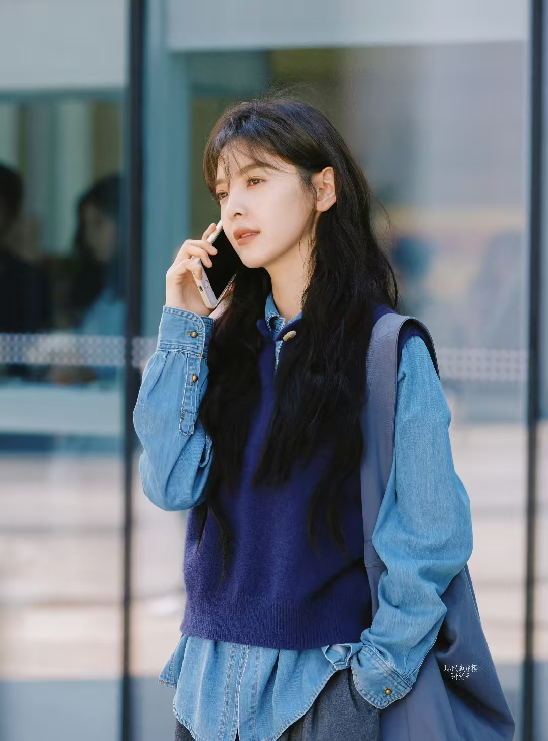 第三套更加温婉,蓝色衬衫作为内搭,外面搭配一件V领米白色绞花毛衣,整体气质显得柔和。
