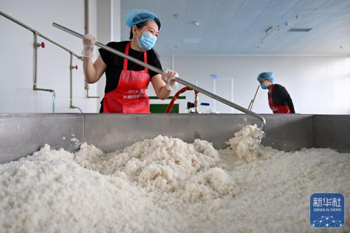 文昌溪北邦兴食品科技有限公司糟粕醋加工厂的工作人员在给蒸熟的大米降温。大米是制作糟粕醋的主要原材料。