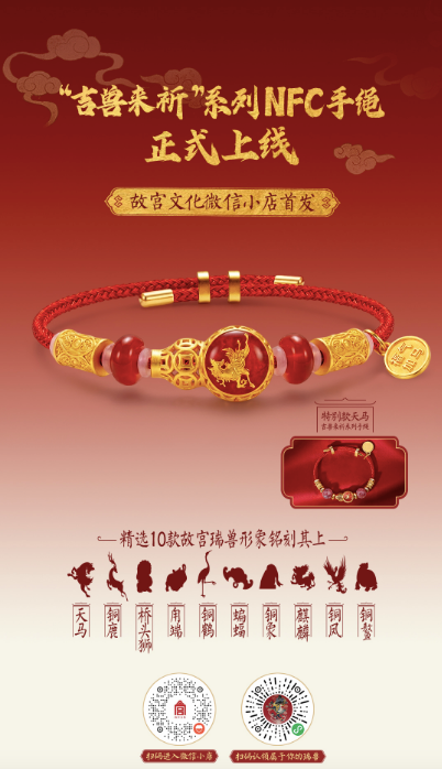 值得注意的是,此次不仅是发布文创产品,更是依托全新的数字化生态能力,即NFC技术、互动小程序与微信社交分享,将文创产品转化为有内容、可互动、可分享的创新文化载体,让600余年的紫禁城祥瑞文化在人们日常生活中流转起来。与瑞兽系列手绳联动的“集兽纳福”微信小程序也同步上线。