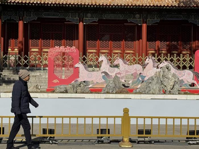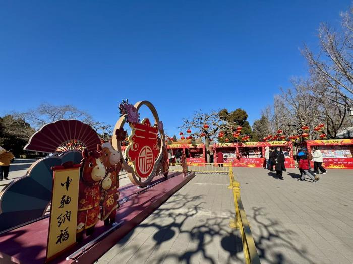 2月8日,北京晴好升温,空气质量优的好天气,让景山公园的马年新春氛围愈发浓厚。东门内的萌趣马年主题装置成为市民周末打卡的热门之选。