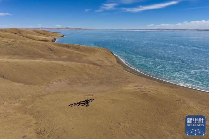 3月10日,一群牦牛在青海省果洛藏族自治州玛多县境内的扎陵湖边觅食(无人机照片)。