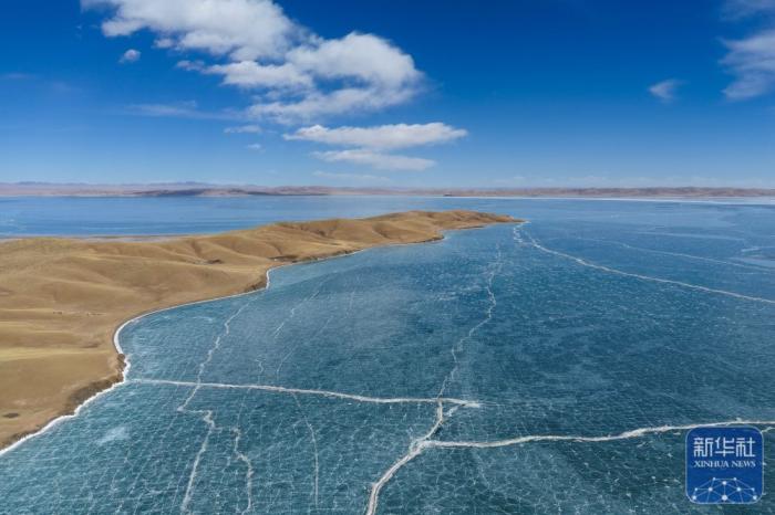 3月10日在青海省果洛藏族自治州玛多县境内拍摄的扎陵湖一角(无人机照片)。