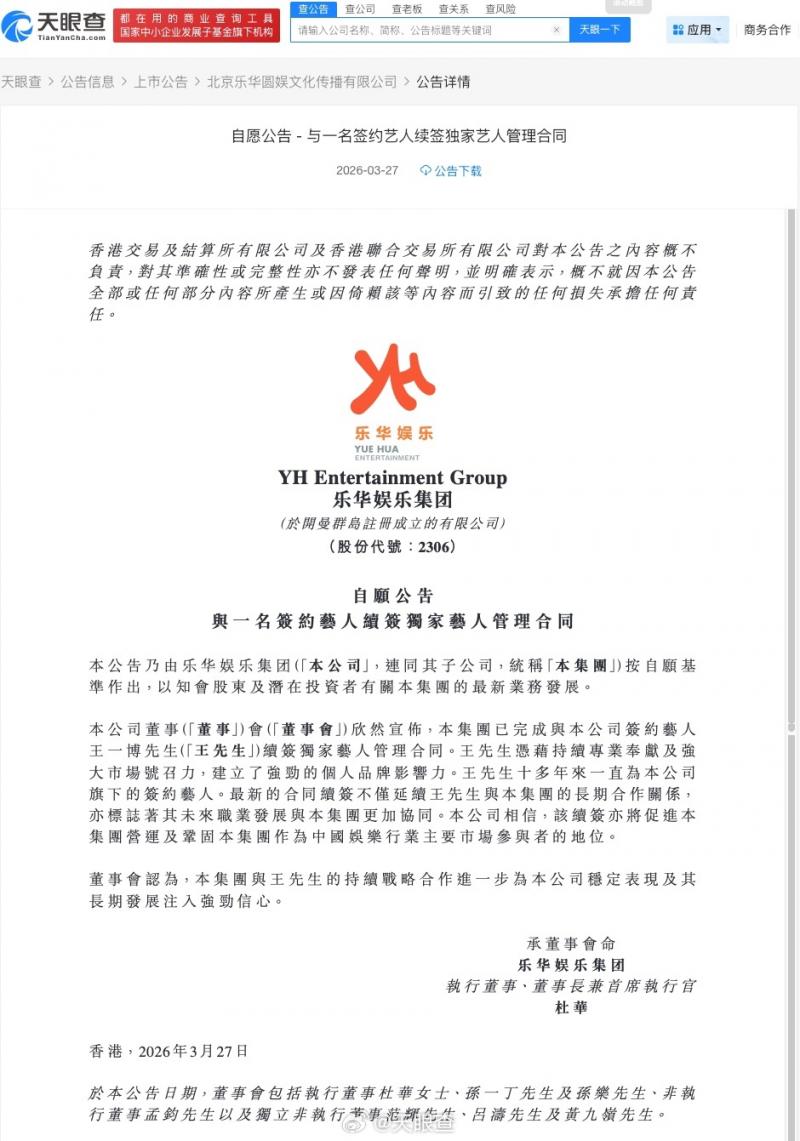 3月27日,乐华娱乐发布公告,宣布与演员王一博已完成续签艺人管理合同。“不仅延续王先生与本集团的长期合作关系,也标志着其未来职业发展与本集团更加协同。”