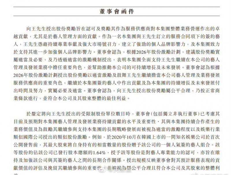 3月25日,乐华娱乐公开的董事会函件显示,公司建议有条件向王一博授出股份奖励:旨在认可及奖励其对集团业务做出的卓越贡献,寻求维持与王一博的长期合作。公告中还提到,若王一博发生严重违约、被定罪、违反保密或非竞争条款等情况,已授出的股份单位将自动失效。