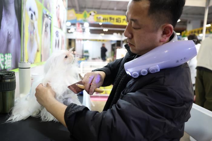 3月27日,宠物展商李沫在展位上给一只宠物犬梳理毛发。