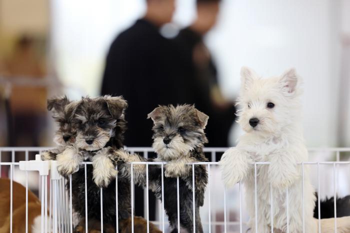 3月27日,几只宠物犬在2026西部宠物展兰州展上。
