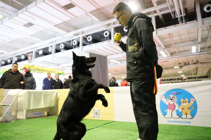 3月27日,训犬师管小刚在2026西部宠物展兰州展上展示训犬。