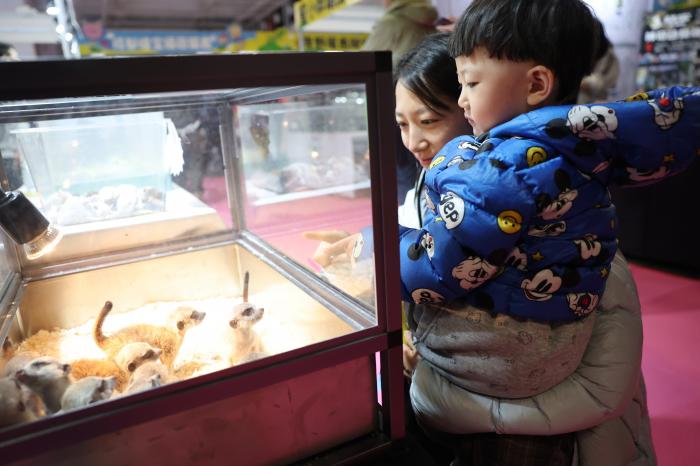 3月27日,家长带着孩子在2026西部宠物展兰州展上观看狐獴。