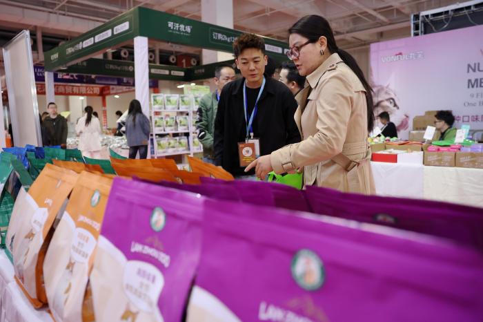3月27日,消费者在2026西部宠物展兰州展上挑选宠物食品。