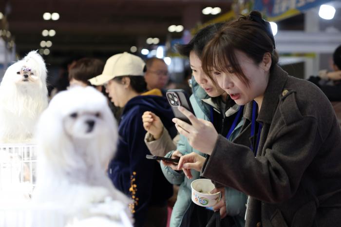 3月27日,消费者在2026西部宠物展兰州展上用手机拍摄宠物犬。