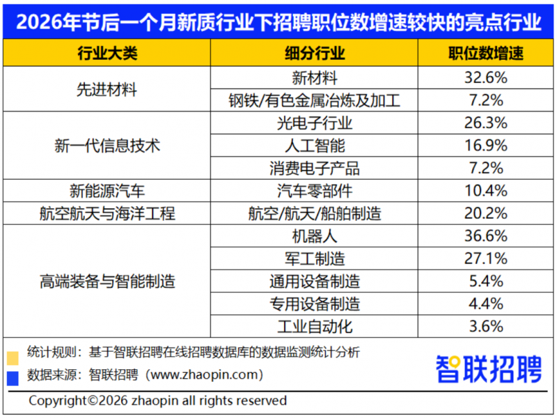 从智联招聘平台监测数据看,2026年春节后一个月,8大新质生产力行业中,先进材料、新一代信息技术、新能源汽车、航空航天与海洋工程、高端装备与智能制造等技术链条靠前的行业职位数同比增速表现突出,成为吸纳人才的重要领域。