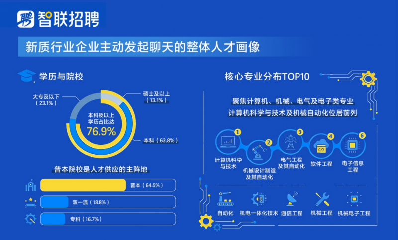 专业方面,企业重点关注计算机类、机械类、电气类、电子类专业求职者。在企业研发技术岗主动发起邀约的求职者中,所学排名前五的专业依次为计算机科学与技术、机械设计制造及其自动化、电气工程及其自动化、软件工程、电子信息工程。这些专业与新质产业在新一代信息技术、高端装备与智能制造、新能源等领域的技术需求高度匹配,是企业主动寻访人才的主要来源。