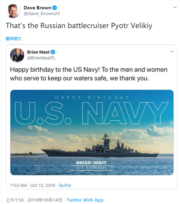 为美海军庆生用俄舰艇配图?这位国会议员尴尬了