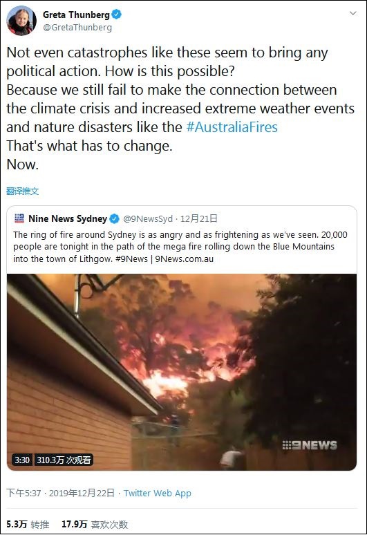 面对这一灾难,千里之外的通贝里坐不住了,她转发了这条推特,并愤怒评论道:“即使是这样的灾难似乎也不会带来任何政治行动。这怎么可能呢?因为我们仍然没有把气候危机和不断增加的极端天气事件和自然灾害(例如澳大利亚大火)联系起来。这是必须改变的。”