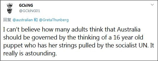 在相关的推特下,有人对通贝里展开了批评:“我不敢相信有多少成年人认为,澳大利亚应该被一个由‘社会主义者’联合国操控的16岁‘傀儡’操控。这真令人震惊!”