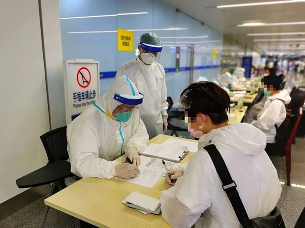 南宁吴圩机场海关关员对入境旅客采集咽拭子