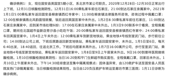行动轨迹显示,该确诊病例在12月31日乘私家车前往石家庄,后返回固安县。1月2日乘私家车前往石家庄;4日乘私家车到新宫地铁站,乘坐地铁4号线到宣武门站,步行前往公司。