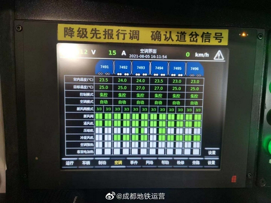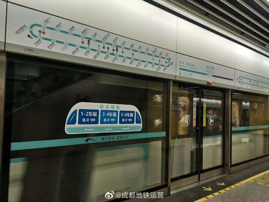 此外,8月6日,成都地铁运营官方微博发布消息,7号线电客车分区控温当日上线。目前7号线采取1、2、5、6车厢设置为强冷车厢,目标温度为25摄氏度,3、4车厢设置为弱冷车厢,目标温度为27摄氏度。乘客可以根据站台标识选择适合自己的车厢。