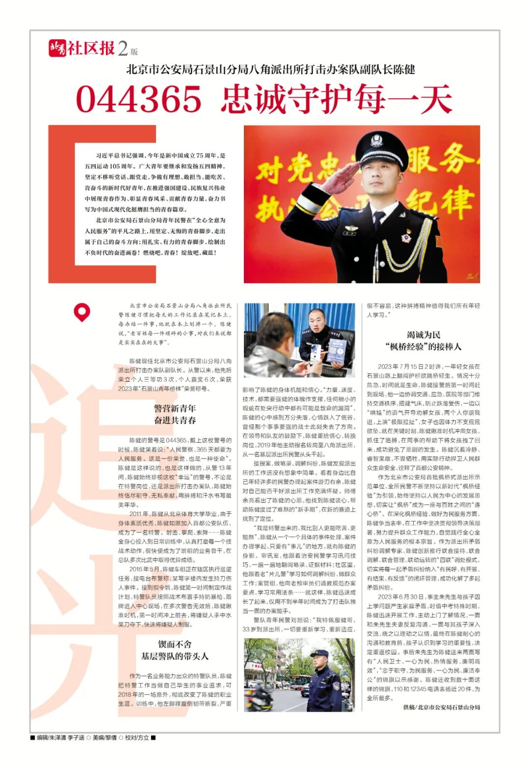 陈健现任北京市公安局石景山分局八角派出所打击办案队副队长。从警以来,他先后荣立个人三等功3次、个人嘉奖6次,荣获2023年“石景山青年榜样”荣誉称号。