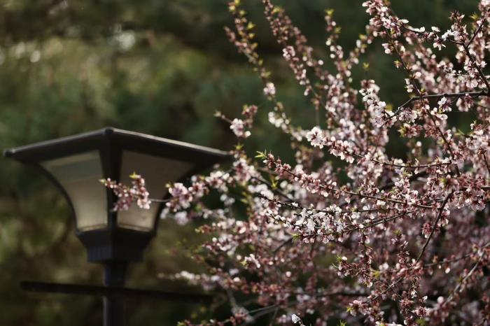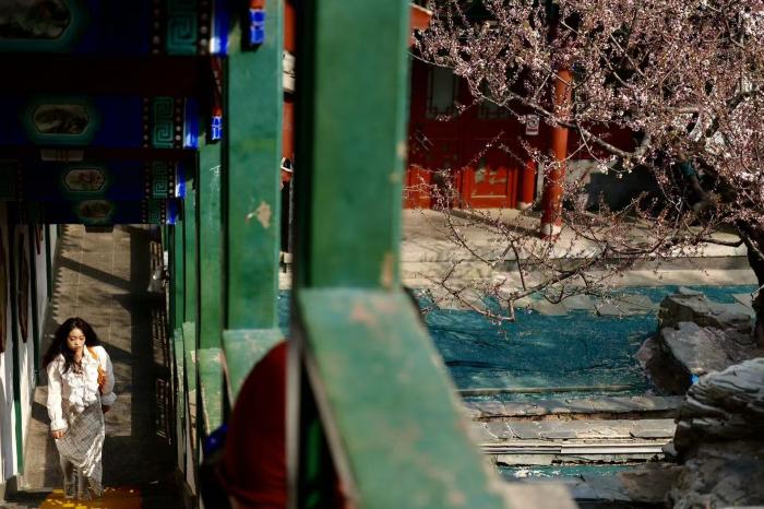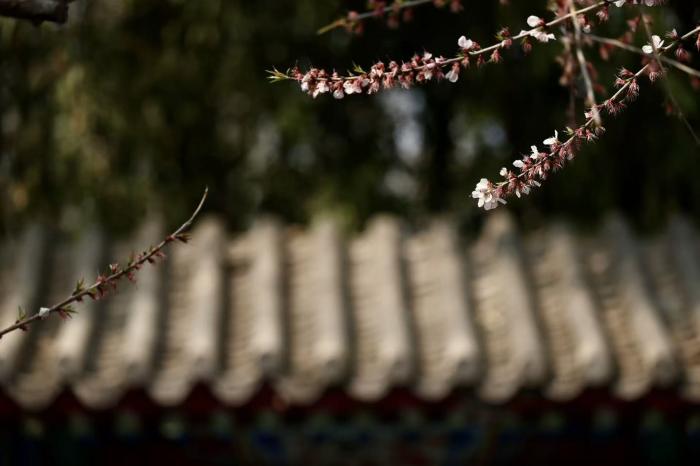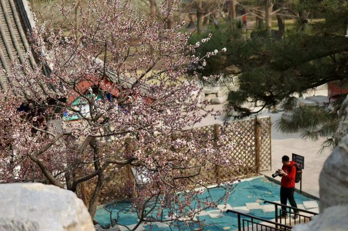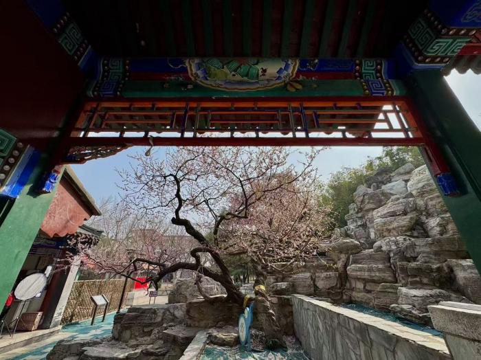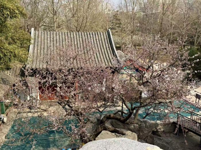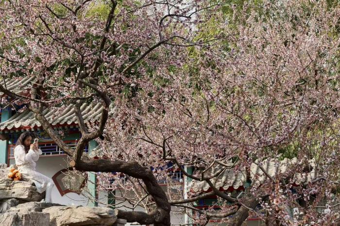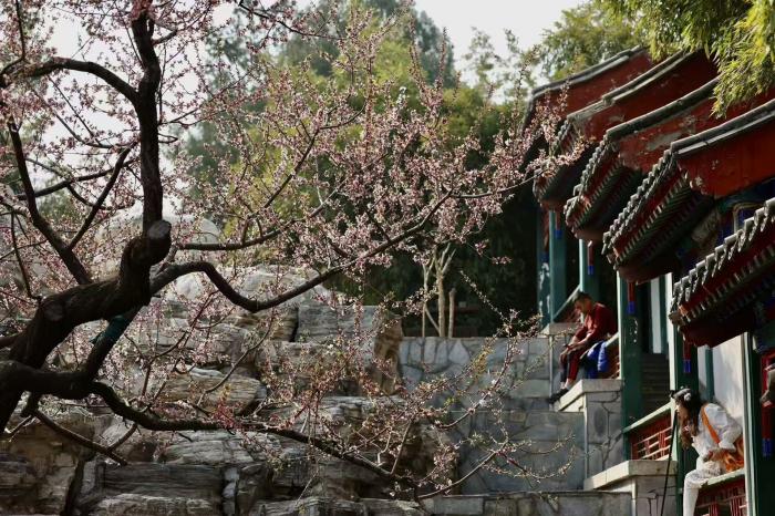 春风送暖,京城各处春花次第绽放。在万寿公园内,数株桃花迎着暖阳竞相开放,粉白相间的花朵缀满枝头,与园内古色古香的亭台楼阁、叠石假山相映成趣,勾勒出一幅雅致的春日图景。